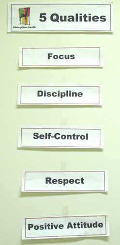 Because of our positive attitude, we have learned how to play the drums, to do a simple dance, and also to speak many phrases in Wolof, the language of Senegal: my name is; yes; no; thank you; you're welcome; I'm listening/I understand; how are you, I'm fine.