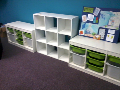 The new shelves are ready to carry their load, and Krystle has led a massive effort to organize and color code the BTI library.